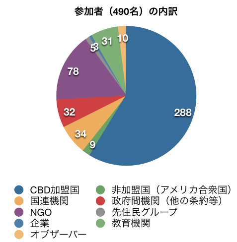 また、SBSTTA参加者(登録者)490名でした。内訳は、CBD加盟国288名(うち日本政府は11名)非加盟国9名(アメリカ合衆国)国連機関34名,政府間機関(他の条約等。IUCNもここ)32名,NGO78名, ILC5名,企業3名,教育機関31名,その他10名(以上手集計)です。